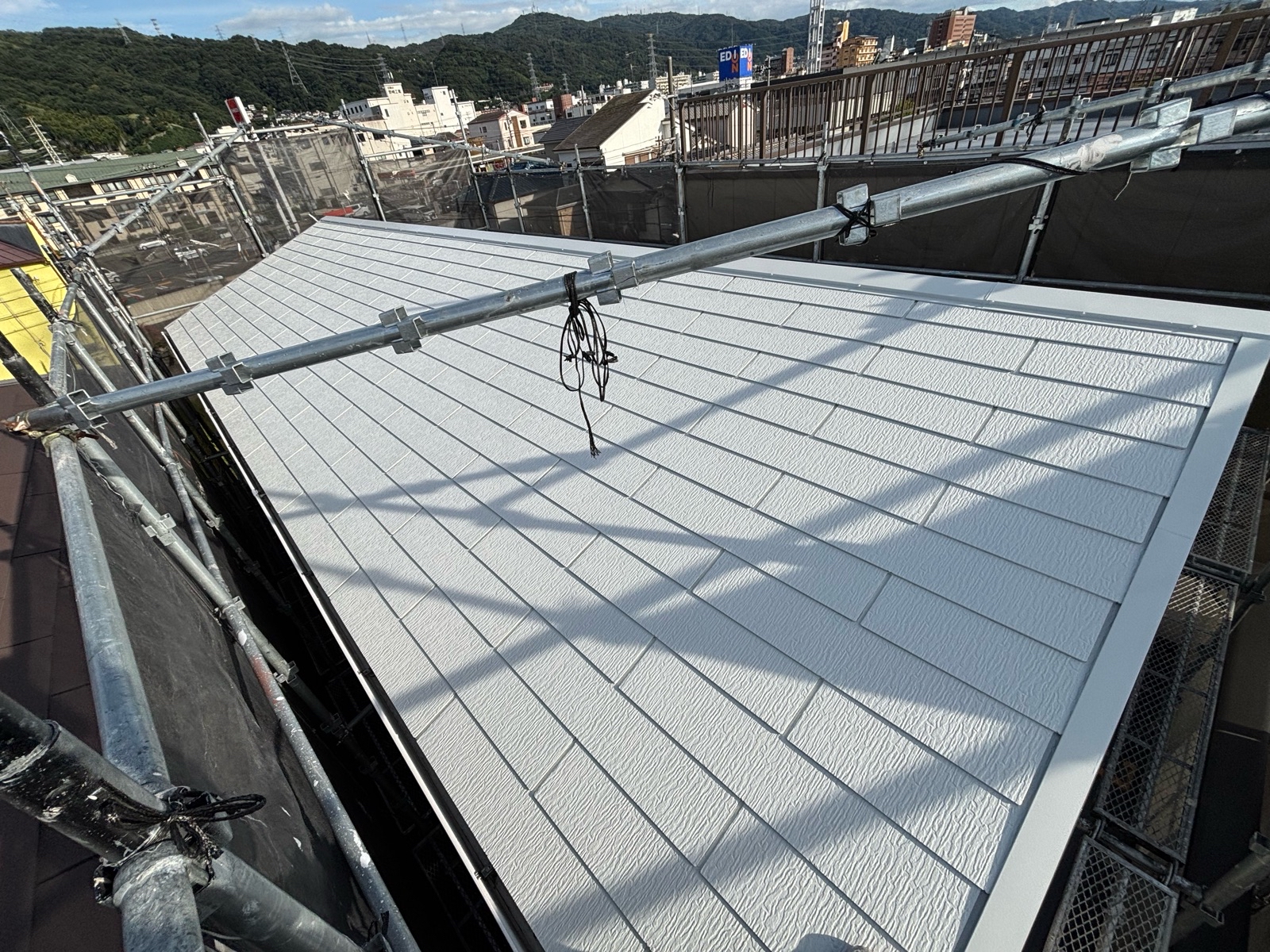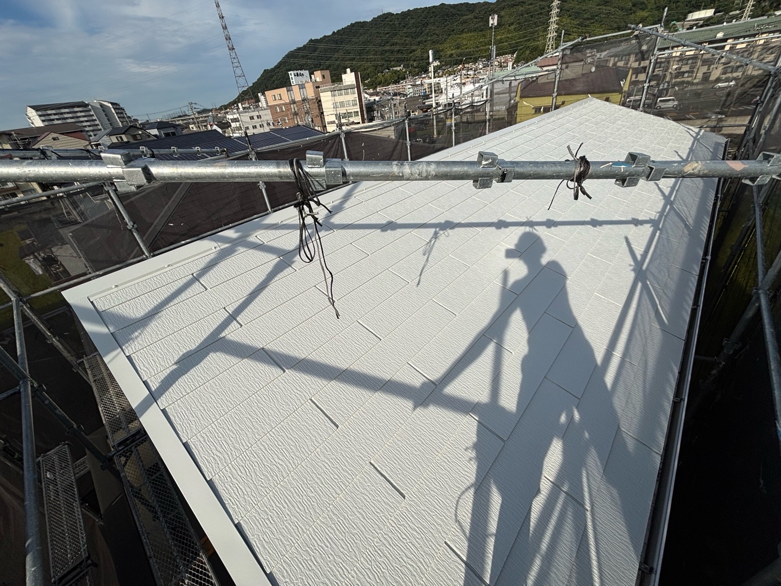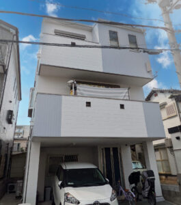 屋根は遮熱塗料の白で日射反射率を最大に上げ、外壁は遮熱性能の有るプラチナラファインMFを使用。
