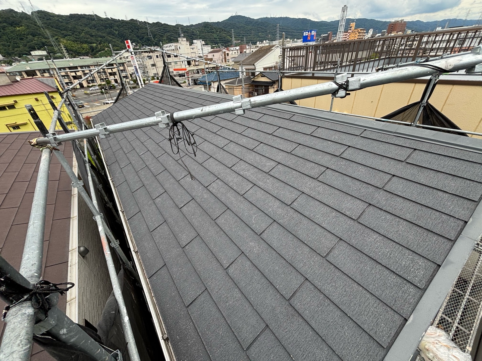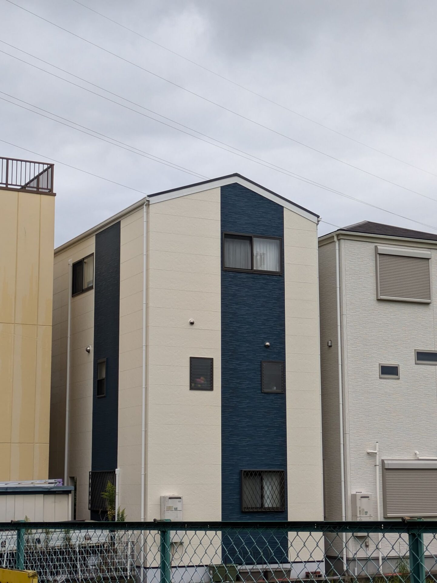 外壁の塗分けは元の配色を参考に、ブロークンホワイトとマウンテンブルーで塗分けを行い、屋根のケラバ水切り板金は周囲からの見え方を考え、アクセントとして黒に塗分けをおこないました。