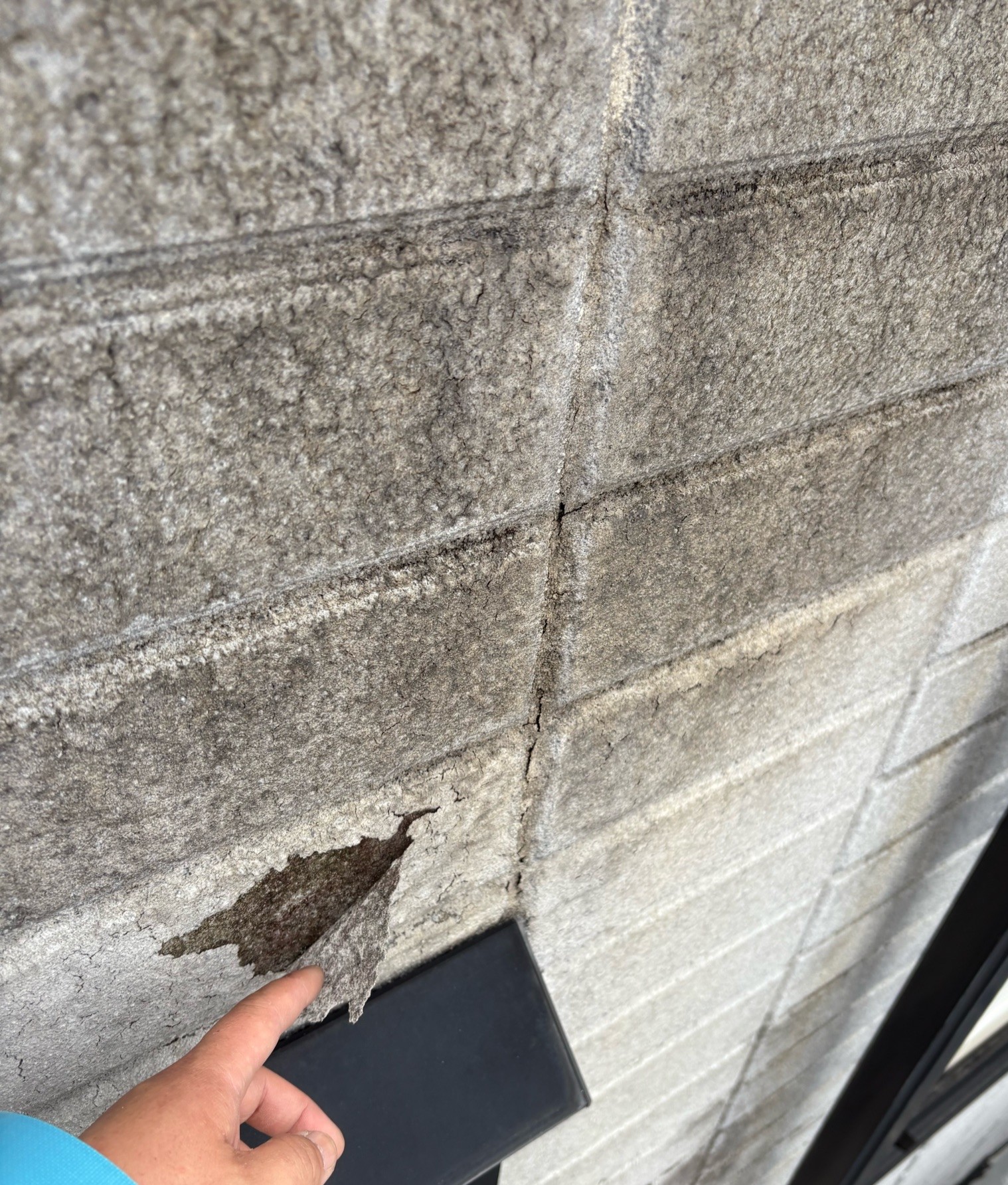 一度外壁塗装を施工済みの物件で、以前は訪問販売の業者に石調の吹付塗装で仕上げが行われておりました。 下塗りの処理が良くなかった為か、外壁各所で塗膜の捲れが発生していた為、今回弊社にご依頼いただきました。 既存塗膜の脆弱部は捲って、左官下地調整、骨材入りの下塗りでパターン調整、全体を浸透性の高いシーラーとフィラーの2工程での下塗りを行わせていただきました。