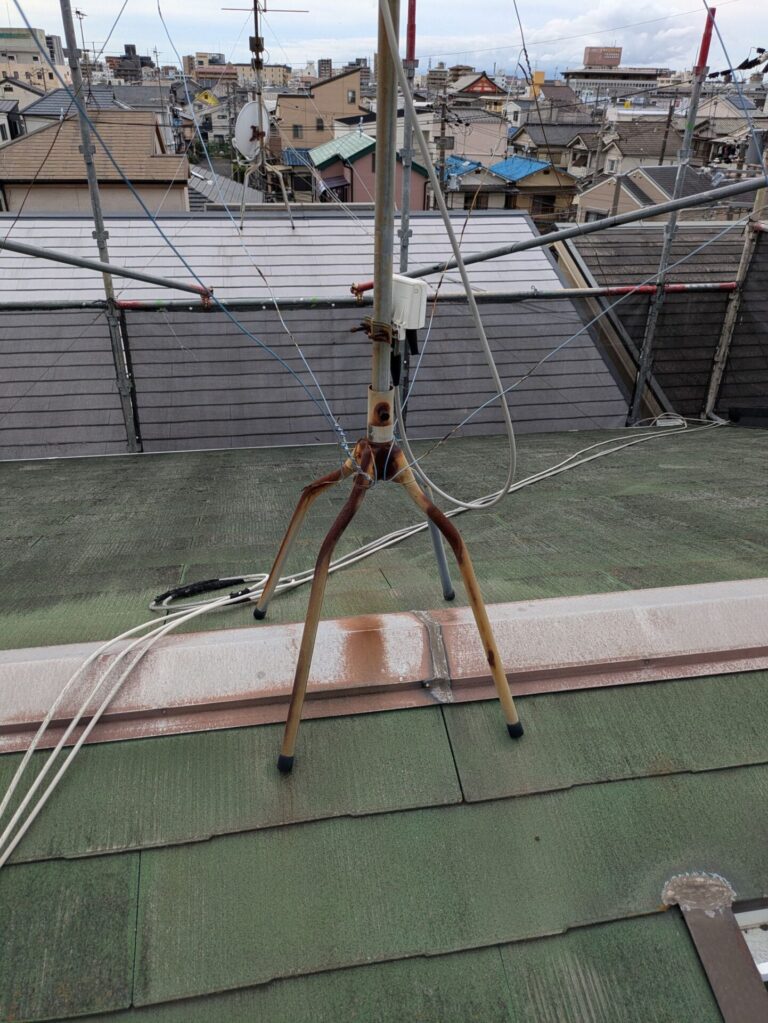 夏場の暑さが気になるとの事で、屋根は日射反射率の高い白にて塗装、アンテナの撤去と、ブロードバント用のアンテナ線の補修も行っております。