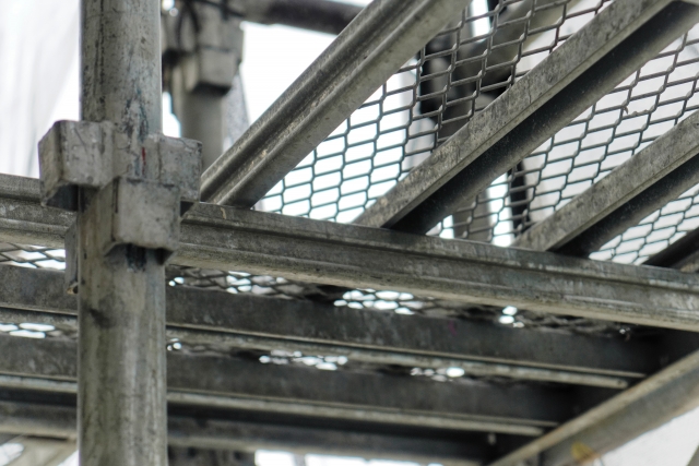 外壁塗装工事中は、建物の周囲に足場を組み立て、高圧洗浄や塗装作業を行います。